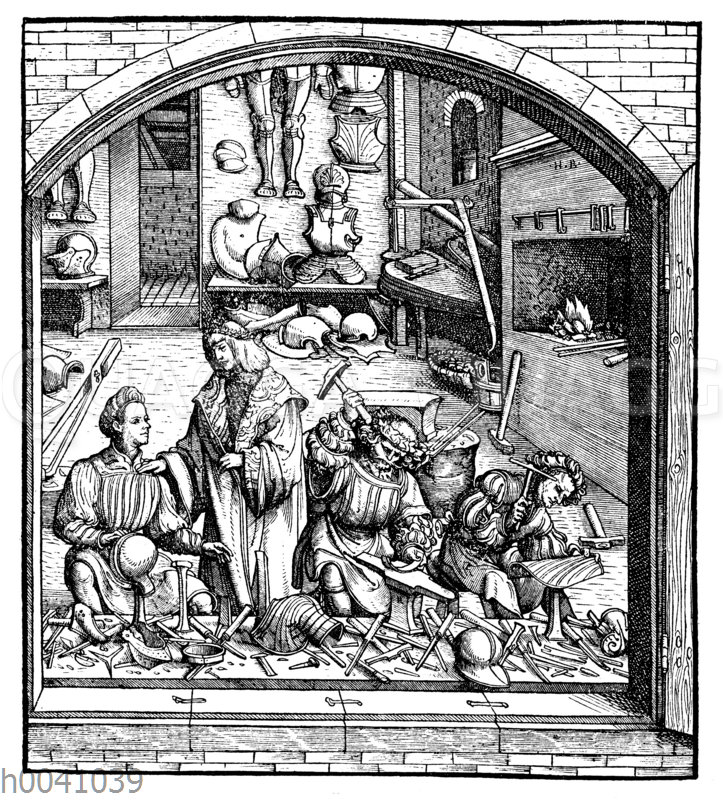 Waffenschmied um 1500: Zeichnung/Illustration/Holzstich – – The workshop of an armourer around the year 1500. One sees from the street through the opened shops into the workshop, to which Emperor Max pays a visit facsimile of the woodcut of Hans Burgkmair in Emperor Maximilian I. „Weißkunig““.“ – L’atelier d’un armurier vers l’an 1500, on voit de la rue à travers les magasins ouverts dans l’atelier, où l’empereur Max visite le fac-similé de la gravure sur bois de Hans Burgkmair dans Empereur Maximilian I. „Weißkunig““.“