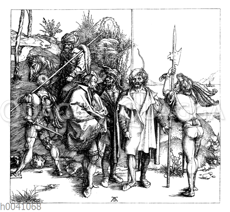 Kriegsleute um die Wende des fünfzehnten Jahrhunderts: Zeichnung/Illustration/Holzstich – – War people at the turn of the fifteenth century. Facsimile of the engraving by Albrecht Dürer. In the middle two noblemen in coats, in the background a Turkish rider –