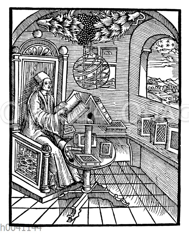 Interieur um 1500: Stube eines Gelehrten: Zeichnung/Illustration/Holzstich – – Interior around 1500: room of a scholar working in beautifully carved chairs on the lectern. On a bank running along the wall, several books, a celestial globe hangs down from the ceiling – Intérieur vers 1500: salle d’un savant travaillant dans des chaises magnifiquement sculptées sur le lutrin. Sur une banque courant le long du mur, plusieurs livres du plafond, pend un globe céleste