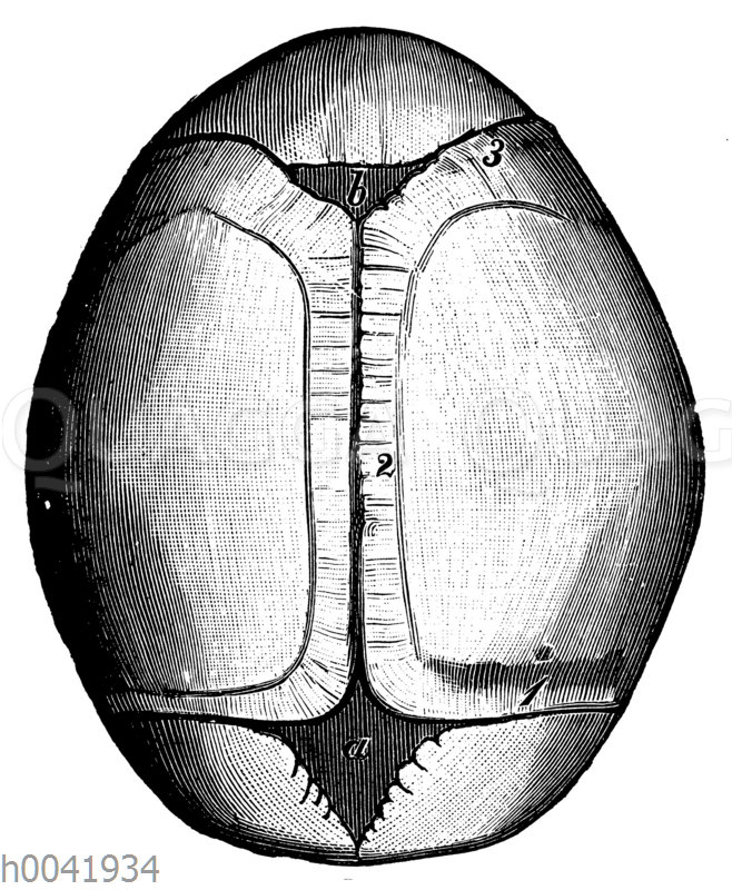 Fontanellen am Schädeldach eines neugeborenen Kindes: Zeichnung/Illustration/Holzstich – – –