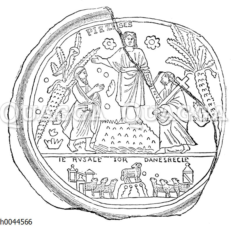 Apostel Paulus und Petrus: Zeichnung/Illustration/Holzstich – – Apostle Paul and Peter. Picture on a gold glass in the Vatican Library. After de Rossi – Apôtre Paul et Pierre. Photo sur un verre d’or dans la bibliothèque du Vatican. Après de rossi