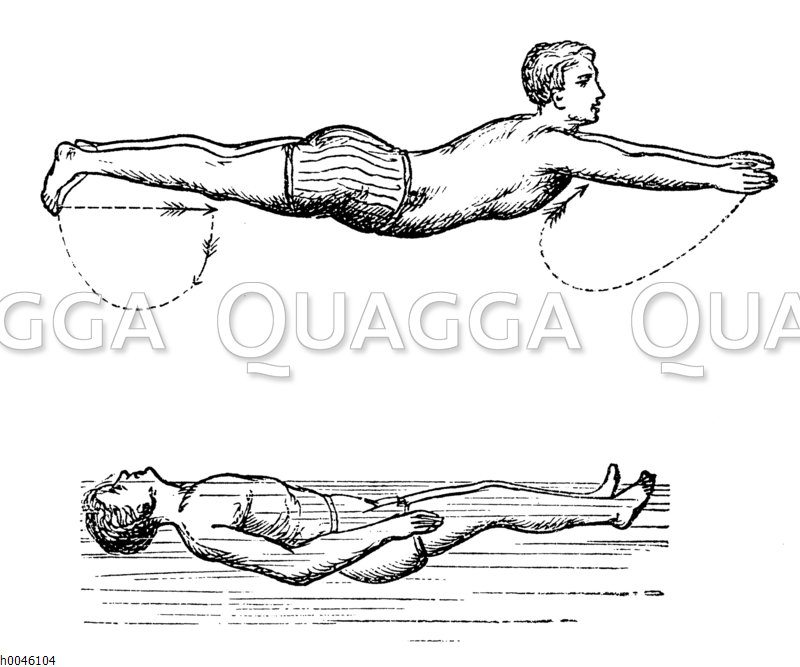 Schwimmen und Rückenschwimmen: Zeichnung/Illustration/Holzstich – – Swimming and backstroke –