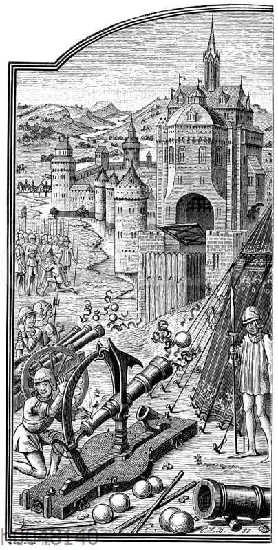 Belagerung von Neuss durch Karl den Kühnen: Beschießung eines Stadttor: Zeichnung/Illustration/Holzstich – – Siege of Neuss by Charles the Bold: Bombardment of a city gate, from the miniatures of Froissart’s magnificent manuscript from Wroclaw. – Siège de Neuss par Charles le Téméraire : Bombardement d’une porte de la ville, d’après les miniatures du somptueux manuscrit de Froissart à Wroclaw.