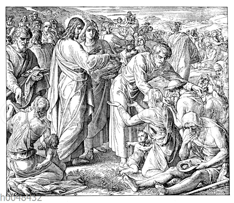 Die Speisung der fünftausend Mann: Zeichnung/Illustration/Holzstich – – The feeding of the five thousand people – L’alimentation des cinq mille hommes