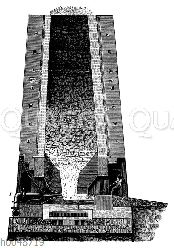 Vertikalschnitt durch einen Hochofen: Zeichnung/Illustration/Holzstich – – –
