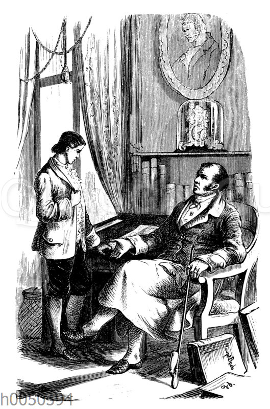 Robinson Crusoe wird von seinem Vater ermahnt zu arbeiten: Zeichnung/Illustration/Holzstich – – Robinson Crusoe is admonished by his father to work – Robinson Crusoé est réprimandé par son père pour qu’il travaille.