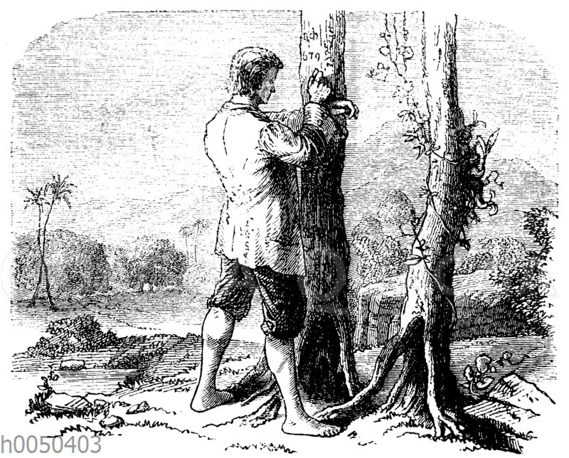 Robinson Crusoe an seinem Kalender: Zeichnung/Illustration/Holzstich – – Robinson Crusoe and his calendar – Robinson Crusoé sur son calendrier