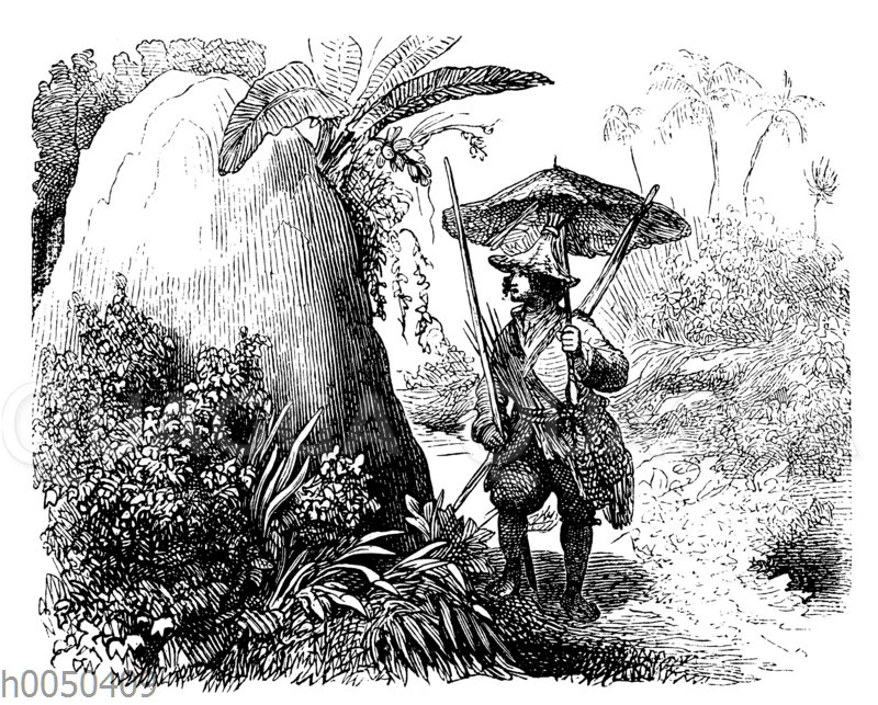 Robinson Crusoe findet statt des Zeltes einen Termitenhügel: Zeichnung/Illustration/Holzstich – – Robinson Crusoe finds a termite hill instead of the tent – Robinson Crusoé trouve une colline de termites à la place de la tente