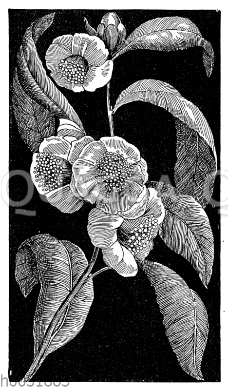 Teestrauch: Zeichnung/Illustration/Holzstich – Camellia sinensis – tea plant – thé