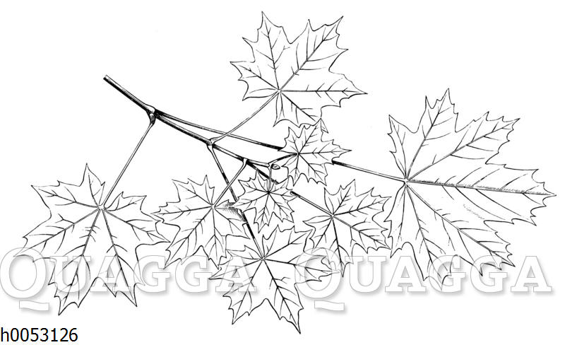 Spitzahorn: Blättermosaik: Zeichnung/Illustration/Holzstich – Acer platanoides – Norway maple – Érable plane