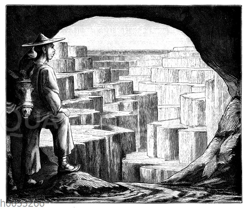 Löss-Tal in der chinesischen Provinz Shansi: Zeichnung/Illustration/Holzstich – – Loess Valley in the Chinese Province of Shansi. After F. v. Richthofen’s ‚China‘. – Vallée de lœss dans la province chinoise de Shansi. D’après ‚Chine‘ de F. v. Richthofen.