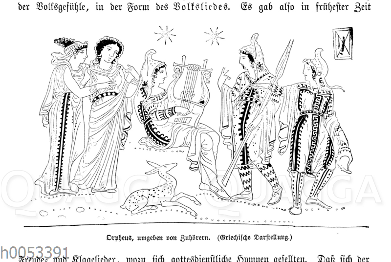 Orpheus, umgeben von Zuhörern: Zeichnung/Illustration/Holzstich – – –