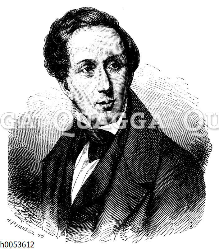 Hans Christian Andersen: Zeichnung/Illustration/Holzstich – – Hans Christian Andersen (born April 2, 1805 in Odense, † August 4, 1875 in Copenhagen), Danish poet and writer. After the painting by Jensen – Hans Christian Andersen (né le 2 avril 1805 à Odense, † le 4 août 1875 à Copenhague), poète et écrivain danois. Après le tableau de Jensen