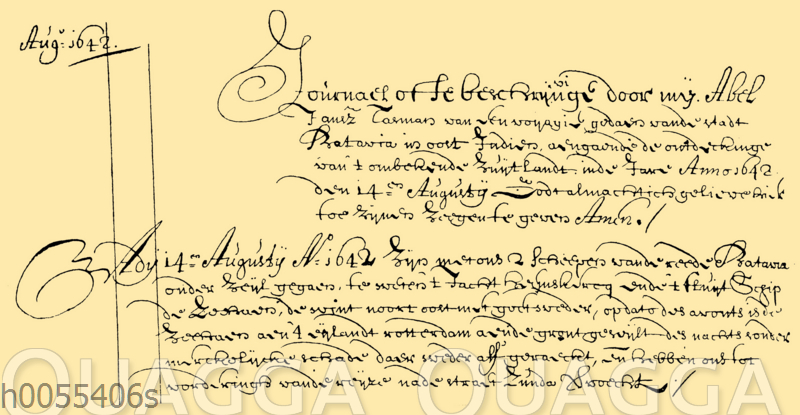 Abel Tasman: Seite aus dem Tagebuch seiner ersten Reise im Jahr 1642: Zeichnung/Illustration/Holzstich – – Tasman, Abel (1603-1659), Dutch sailor. Page from the diary of his first voyage in 1642 – Tasman, Abel (1603-1659), marin hollandais. Page du journal de son premier voyage en 1642