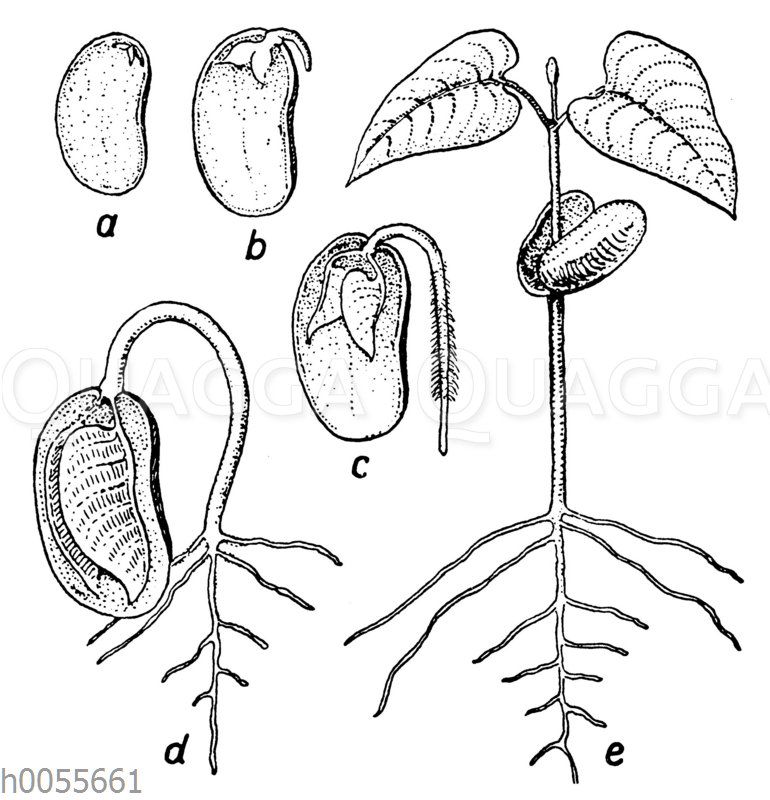 Keimung der weißen Gemüsebohne: Zeichnung/Illustration/Holzstich – – –