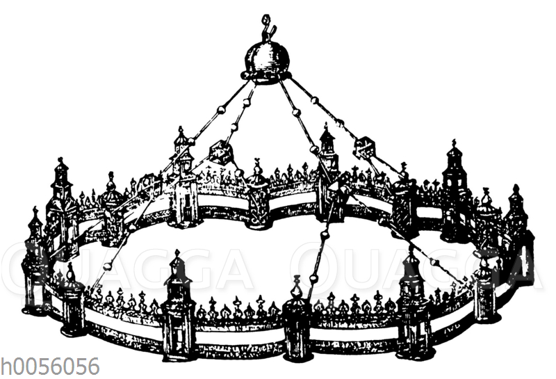 Kronleuchter Friedrich Barbarossas im Aachener Münster: Zeichnung/Illustration/Holzstich – – Chandelier Friedrich Barbarossas in the Aachen Cathedral (12th century AD) – Lustre de Friedrich Barbarossa dans la cathédrale d’Aix-la-Chapelle (XIIe siècle après JC)