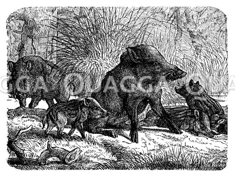Wildschweinfamilie: Zeichnung/Illustration/Holzstich – Sus scrofa – Boar