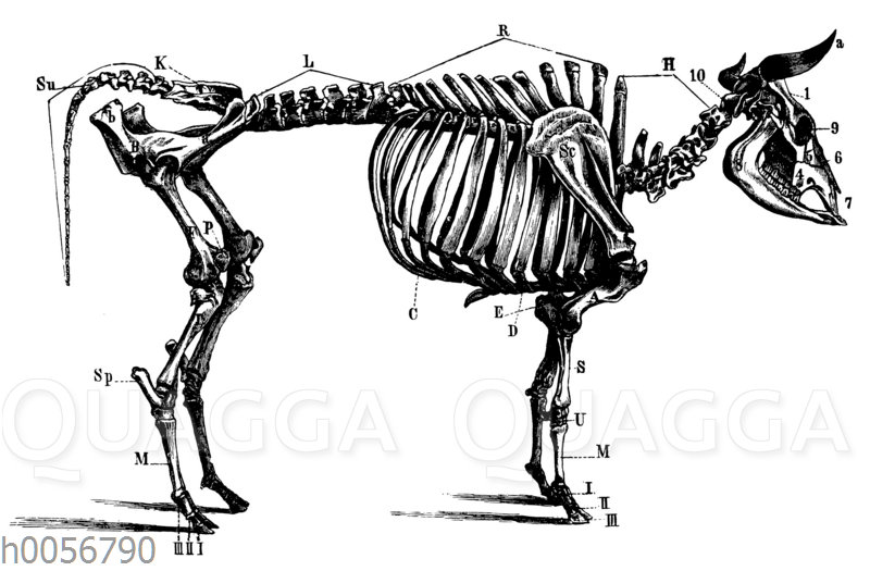 Skelett des Rindes: Zeichnung/Illustration/Holzstich – – –