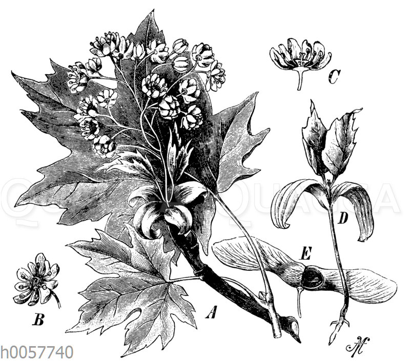 Spitzahorn: Zeichnung/Illustration/Holzstich – Acer platanoides – Norway maple – Érable plane