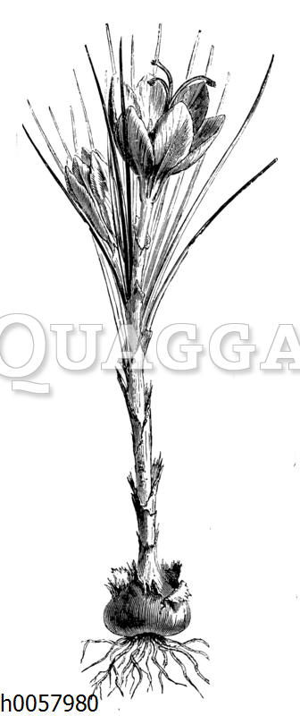 Safran-Krokus: Zeichnung/Illustration/Holzstich – Crocus sativus – Saffron – crocus cultivé, crocus à safran, Safran, Safran cultivé