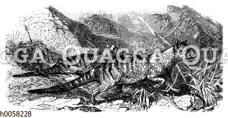 Beutelwolf: Zeichnung/Illustration/Holzstich – Thylacinus cynocephalus – thylacine – Le thylacine ou loup marsupial, loup de Tasmanie ou encore tigre de Tasmanie