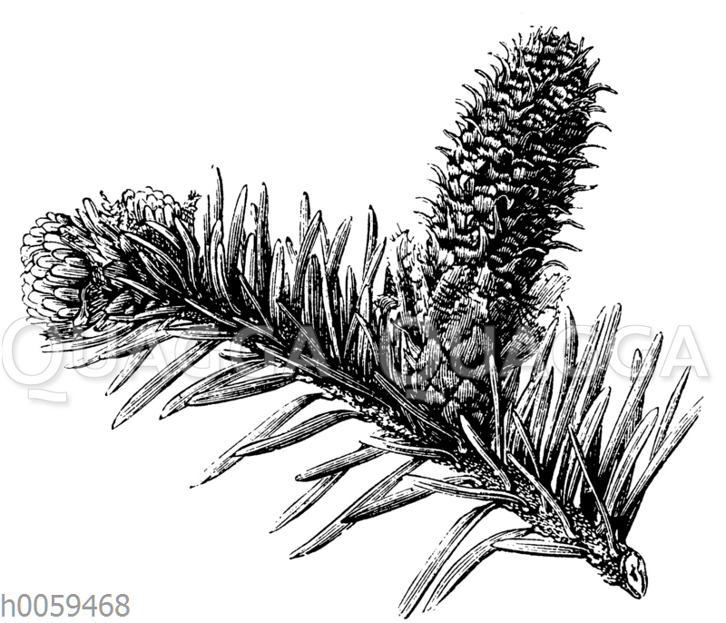 Edeltanne, Zweig mit weiblichen Blüten: Zeichnung/Illustration/Holzstich – Abies alba – –