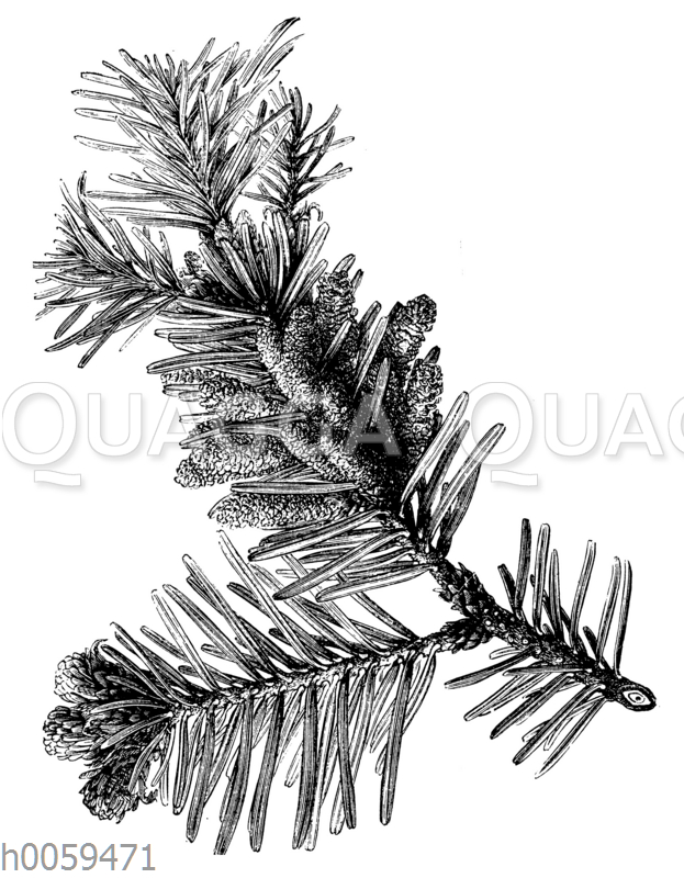 Edeltanne, Zweig mit männlichen Blüten: Zeichnung/Illustration/Holzstich – Abies alba – –