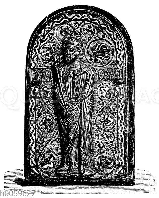 Romanische Altarplatte mit Grubenschmelz und Relieffigur: Zeichnung/Illustration/Holzstich – – –