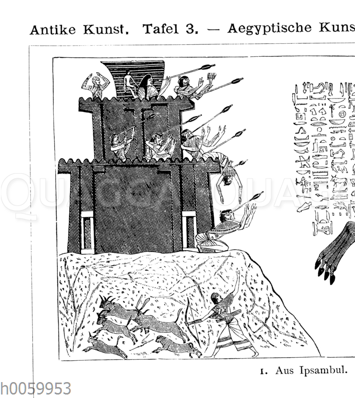 Ramses II. mit seinen Söhnen erobert eine Bergfestung: Zeichnung/Illustration/Holzstich – – –