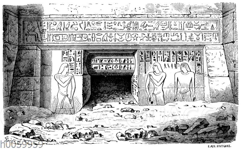Felsgrab von Gizeh. Vorderansicht: Zeichnung/Illustration/Holzstich – – –