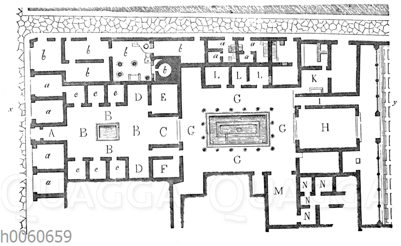 Haus des Pansa zu Pompeji. Grundriss. A. Vestibulum. B. Atrium. C. Tablinum. DD. Alae. E.F. ? G. Peristylium (Porticus). H. Oecus (Gesellschaftszimmer). I. Gang. K.L. ? M. Triclinium (Speisesaal). N. ? a. Verkaufsläden. b. Bäckerei mit Mühle, cc. Cellae und Cubicula (Kammern und Schlafzimmer) x. Hauptstraße. y. Garten.