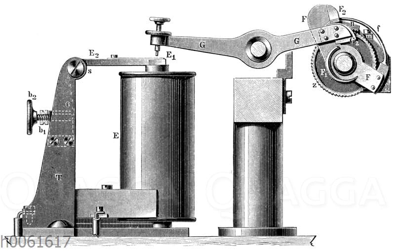 Elektromagnetsystem und Verkupplung des Hughes-Apparats: Zeichnung/Illustration/Holzstich – – –