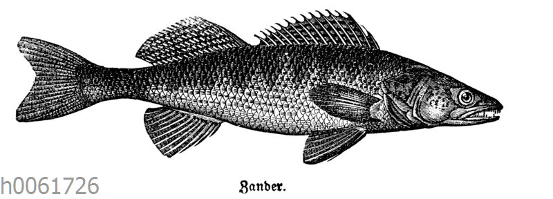 Zander: Zeichnung/Illustration/Holzstich – Sander lucioperca, Syn.: Stizostedion lucioperca, Lucioperca sandra – zander – sandre
