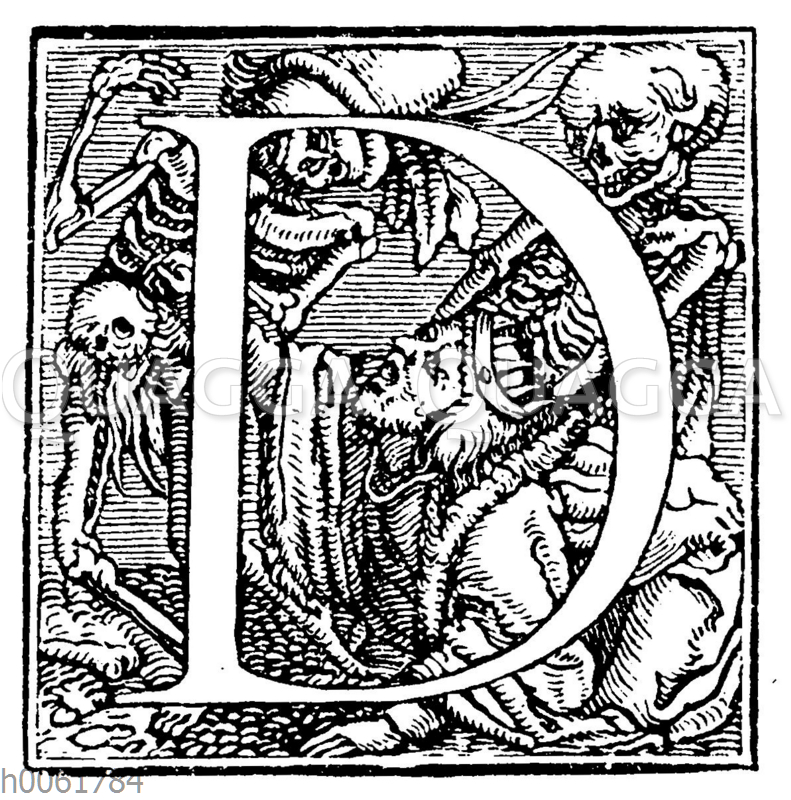 Buchstabe D aus Holbeins kleinerem Totentanzalphabet: Zeichnung/Illustration/Holzstich – – Letter D from Holbein’s smaller death dance alphabet – Lettre D du petit alphabet de danse macabre de Holbein.