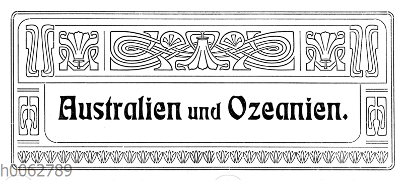 Schriftzug ‚Australien und Ozeanien‘ mit Rahmen: Zeichnung/Illustration/Holzstich – – –