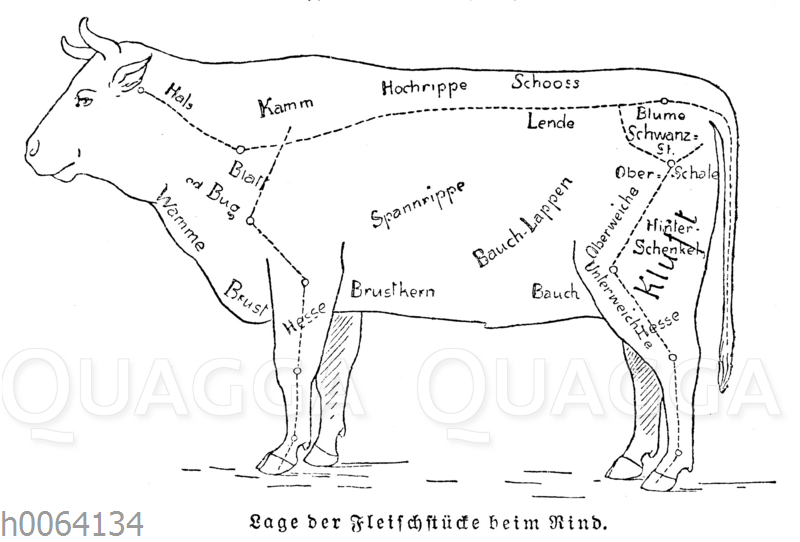 Lage der Fleischstücke beim Rind: Zeichnung/Illustration/ – – –