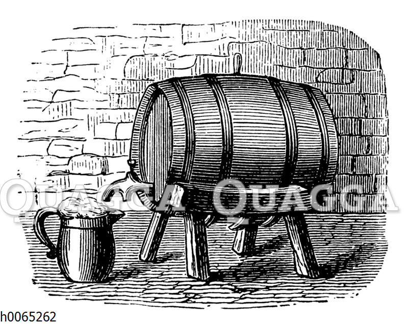 Bierfass im Keller: Zeichnung/Illustration/Holzstich – – Beer barrel and beer mug in the cellar – Baril de bière et chope de bière dans la cave