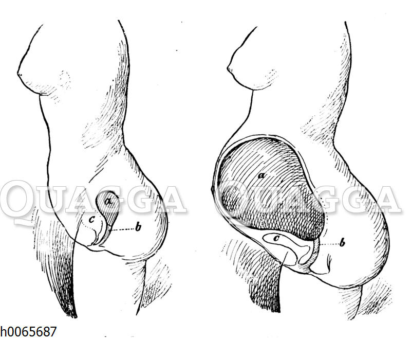 Lage der Gebärmutter in einer nicht-schwangeren (links) und einer schwangeren (rechts) Frau: Zeichnung/Illustration/Holzstich – – –