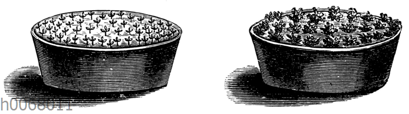 Aussaat im Topf: Zeichnung/Illustration/Holzstich – – Sowing in pot: Plants with enough space – Semis en pot: isolé des plantes