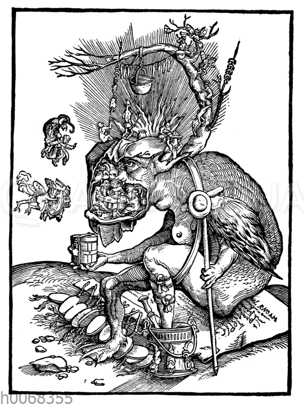 Im Höllenrachen. Spottbild auf das Papstum und die Möncherei: Zeichnung/Illustration/Holzstich – – In the jaws of hell. Caricature of the papacy and monasticism. After a woodcut from the Reformation –