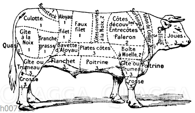 Fleischeinteilung beim Bullen: Zeichnung/Illustration/Holzstich – – –