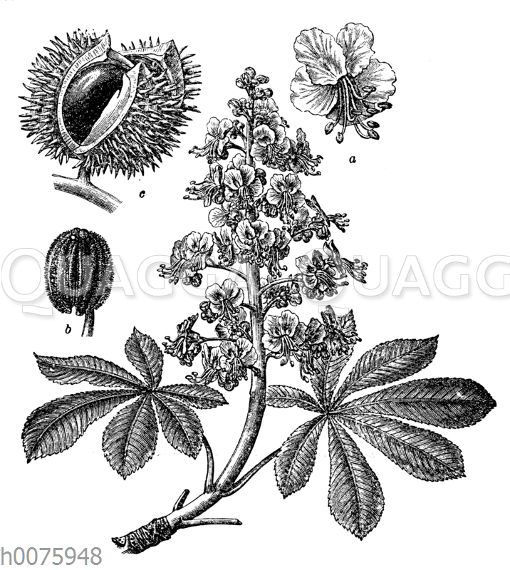Rosskastanie: Zeichnung/Illustration/Holzstich – Aesculus hippocastanum – horse-chestnut, conker tree (Aesculus hippocastanum) – marronnier commun (Aesculus hippocastanum)
