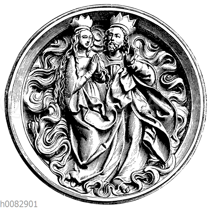 Reliefbild des englischen Grußes, von Veit Stoß: Zeichnung/Illustration/Holzstich – – Relief image of the English greeting, by Veit Stoß – Image en relief du salut anglais, par Veit Stoß