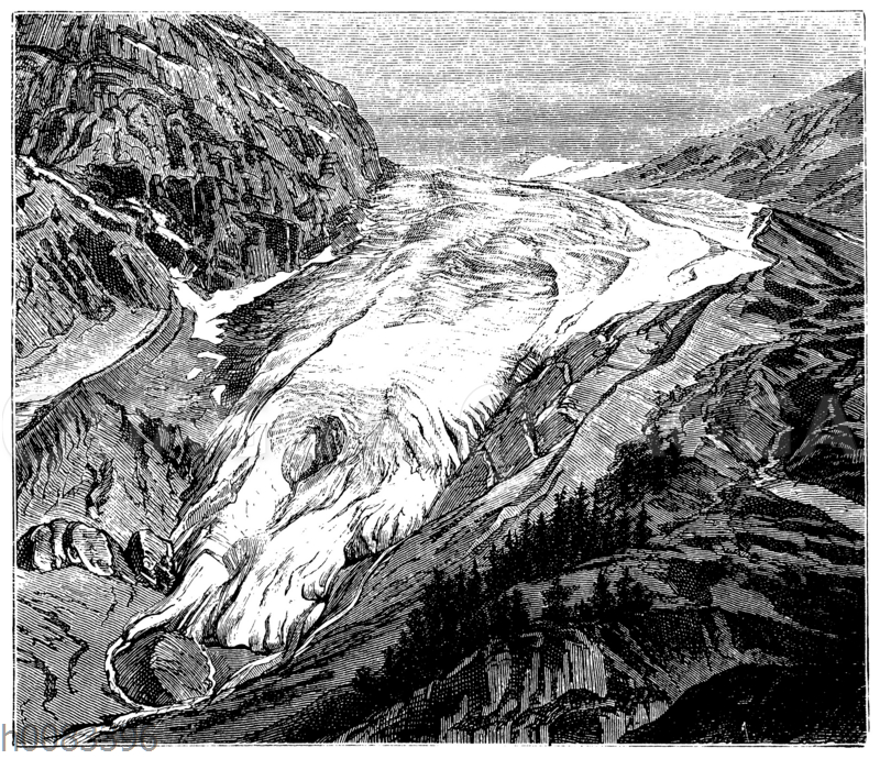 Abfallender und zurückgewichener Gletscher: Madatsch-Gletscher in den Ortler Alpen: Zeichnung/Illustration/Holzstich – – –