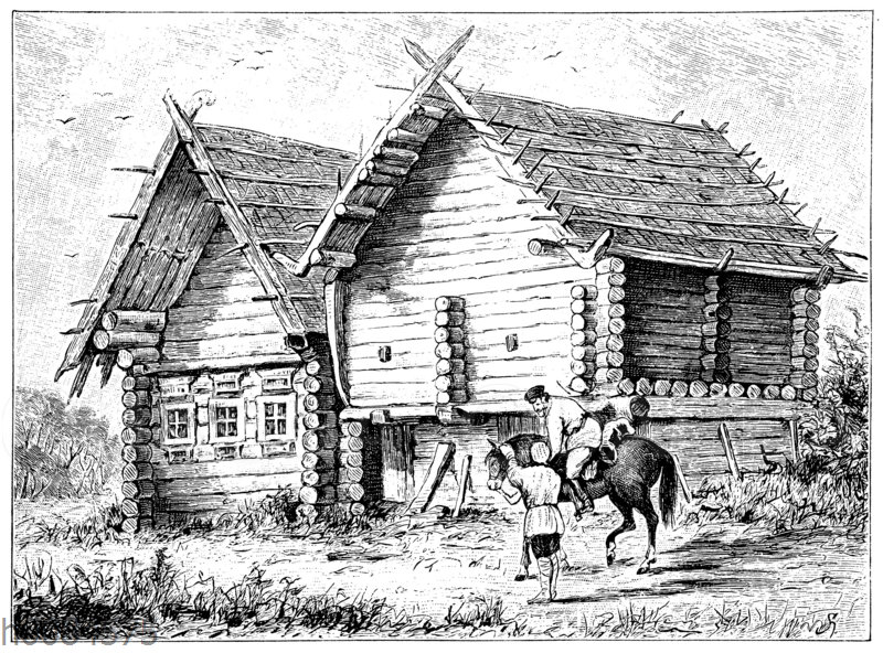 Russisches Bauernhaus, Blockhaus: Zeichnung/Illustration/Holzstich – – –