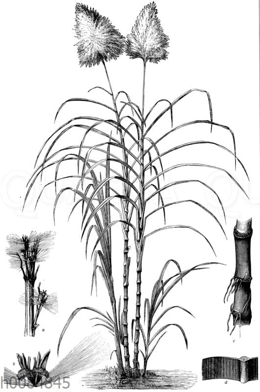 Zuckerrohr: Zeichnung/Illustration/ – Saccharum officinarum – sugarcane a Partie de panicule, b épillet simple, c partie inférieure du chaume, partie transversale du limbe – canne à sucre a Partie de panicule, b épillet simple, c partie inférieure du chaume, partie transversale du limbe