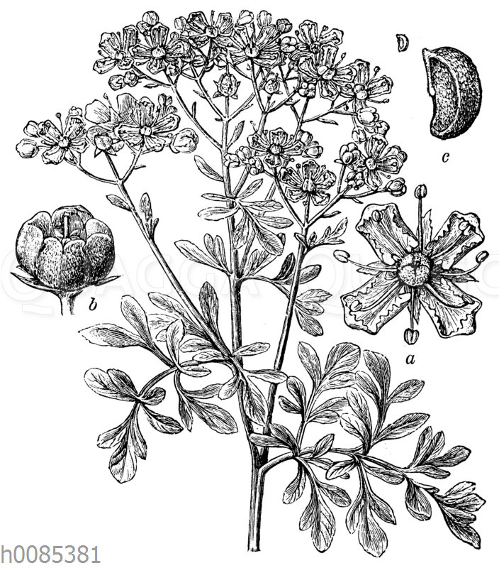 Weinraute: Zeichnung/Illustration/ – Ruta graveolens – rue, a flower, b fruit, c seed – rue officinale, a fleur, b fruit, c graine