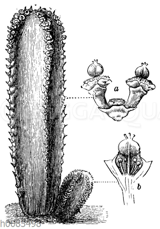 Apothekerwolfsmilch: Zeichnung/Illustration/ – Euphorbia resinifera Syn. Euphorbia officinarum – resin spurge, a cyme, b cyathium, cut through – euphorbe résinifèrea Trompette, b Cyathium, sectionné